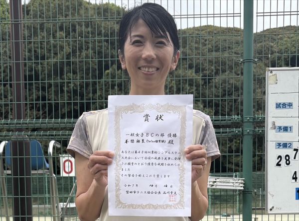 10/12に東大久保コートで行われました「令和7年 第48回双葉杯シングルステニス大会」で本間麻里さんが女子BCクラスで優勝されました。